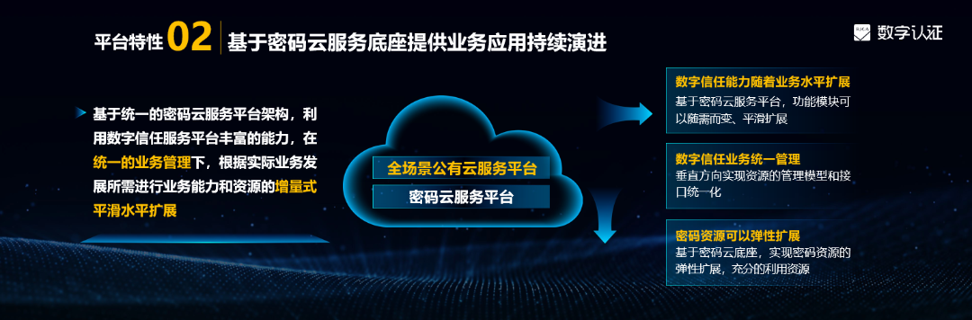 客户的业务在不断演进,平台也必须拥有扩展能力,能够支撑客户业务应用的发展。数字信任服务平台基于统一的密码云服务平台,可以实现双向弹性可扩展,满足客户不断变化的需求。从横向看,功能模块可以随业务水平需求而变、平滑扩展;从纵向看,数字信任业务实现资源的管理模型和接口统一化,底层的密码资源可以随业务的演进实现弹性扩展。