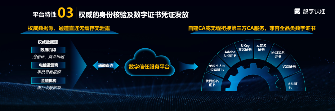 身份核验最重要的是准确率和隐私保护。数字信任服务平台的身份核验充分地解决了这两点,通过直连权威数据源,没有中间平台经手,不仅数据源准确,而且无缓存无泄露。基于准确的身份核验,平台支持各种类型数字证书可信凭证发放。