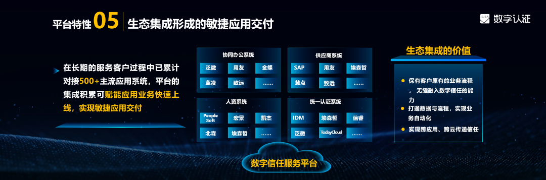 在长期服务客户的过程中,美高梅官网正网累计对接了500+主流应用系统,如此庞大的平台集成积累,可以帮助用户应用业务快速上线,实现敏捷应用交付。对客户而言,美高梅官网正网提供的生态集成,不仅能让客户保有原有的业务流程,具备无缝融入数字信任的能力,还能打通数据与流程,实现业务自动化,更是让跨应用、跨云传递信任照进现实。