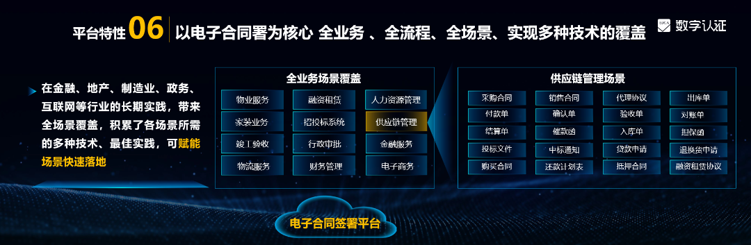 在金融、地产、制造业、政务、互联网等行业所积累的大量的最佳实践,使数字信任服务平台实现了如“融资租赁”、“人力资源管理”、“招投标系统”、“供应链管理”等各种业务场景覆盖,适配不同场景的技术解决方案,可帮助客户准确评估自身业务需求,加速信任场景快速落地。