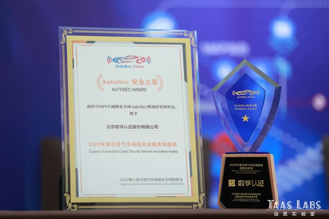 北京美高梅官网正网股份有限公司以“汽车智能网联应用安全解决方案专家”的身份受邀参会,在“AutoSec Award-安全之星”第三届中国汽车网络安全行业颁奖盛典环节,经过网络50万+投票和多轮评比,美高梅官网正网自主研发的V2X车联网网络信任服务平台从100多个创新方案和优秀汽车网络安全产品中脱颖而出,荣获主办方Taas Labs谈思实验室颁发的“年度优秀汽车网络安全服务创新奖”,获得众多与会嘉宾的一致好评。