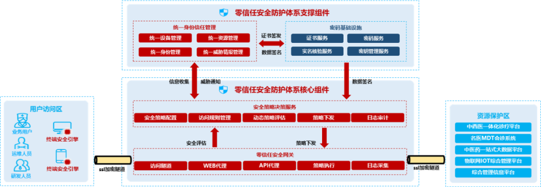 本次获奖应用案例是美高梅官网正网在对黄埔联创院的安全现状和需求进行深入分析后,基于零信任安全理念,充分发挥密码技术的作用,以“可信身份、可信设备、可信网络通信、可信应用、可信数据”为目标,构建的完整网络安全保障体系。该体系综合评估“用户+设备+应用”组合,建设了包含动态身份鉴别、细粒度访问控制、加密通信、电子签名、安全态势分析等在内的网络安全机制,充分满足了患者、专家从互联网接入参与多方会诊、远程复诊等业务流程的保护需求。