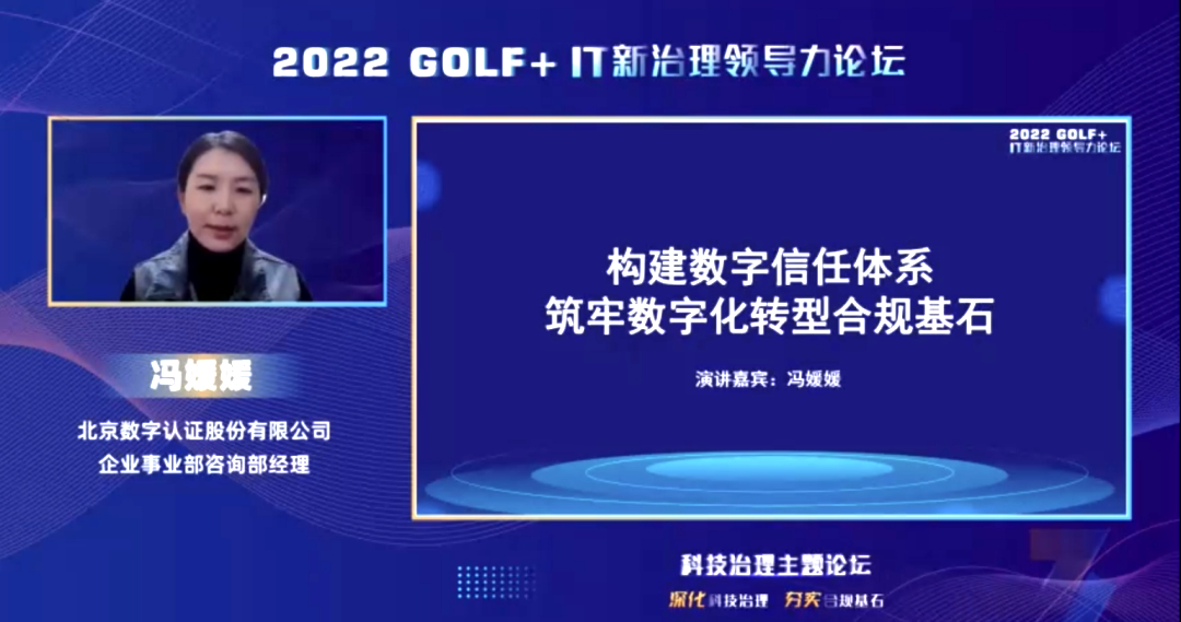 1月6~7日,由中国信息通信研究院、中国通信标准化协会主办,中国内部审计协会、中国互联网协会信息技术(IT)风险治理工作委员会支持的“2022 GOLF+ IT新治理领导力论坛”,以线下结合线上的方式成功举行。美高梅官网正网公司企业事业部咨询部经理冯媛媛受邀出席“科技治理”主题论坛,围绕数字信任在企业数字化转型中的应用与合规管理的实践成效进行了重点分享。