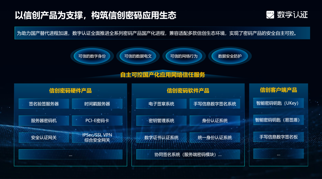 当前,信创已上升为国家战略,信创产业成为国家经济数字化转型、提升产业链发展的关键,《“十四五”国家信息化规划》亦明确2022-2025年要开启新一轮数字经济建设周期,信创产业加速发展,对信息安全提出了更高要求,密码作为保障网络安全的重要基石,是构建信息安全防线和网络信任体系的核心技术,亦对实现信创全生态安全有不可替代的重要作用。