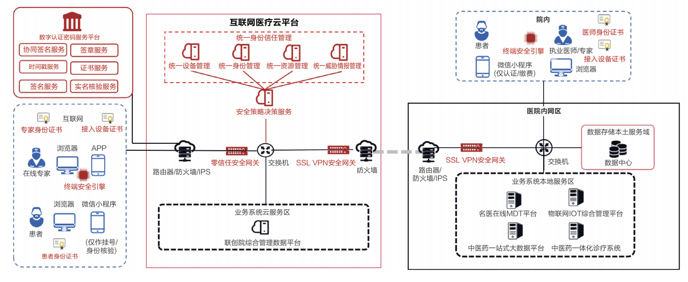 互联网医院零信任解决方案结合密码应用保障技术,以 “可信身份、可信行为、可信数据”为核心,为互联网医院建设包含身份鉴别、细粒度访问控制、端到端安全通道、抗抵赖等技术措施及安全管理措施在内的零信任解决方案,重构医疗卫生安全保障边界和信任。